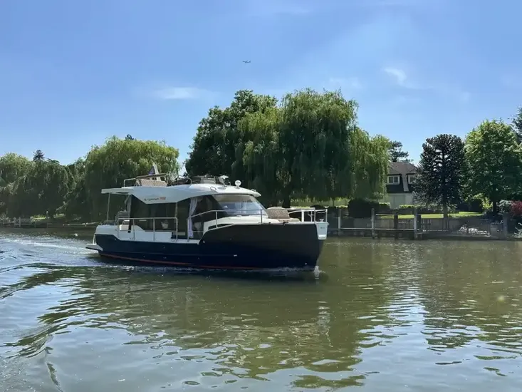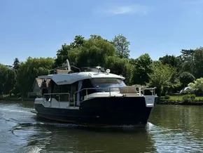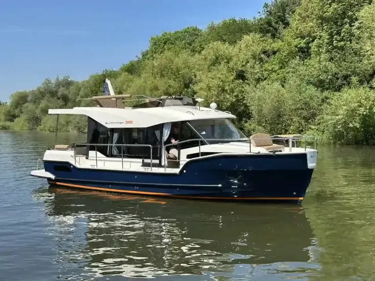 The distinctive hull shape of the SunCamper 35 with its higher bow, offers a dry ride in choppy waters whilst the lower side decks and aft platforms with walk-through transom provides ease of access from pontoons. Underwater the triple keels keep the draft to a minimum whilst offering greater directional stability and precise handling, with a flat aft section to minimise wash. Another distinctive feature SunCamper 35 is the large panoramic windows in the light and airy wheelhouse, internally it can accommodate 7 people overnight in comfort with 2 bathrooms.