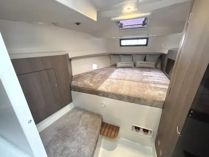 - Open double bow berth with an additional single berth on the port side, cabinet, shelves, a UFO ventilator, and an opening hatch