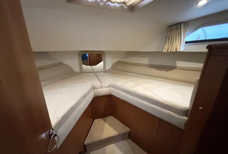 There are two large V-berths with storage beneath and an infill to convert to a double berth and an upholstered headboard. Also two large hanging lockers, reading lights, glass escape hatch with a 2 part blind.