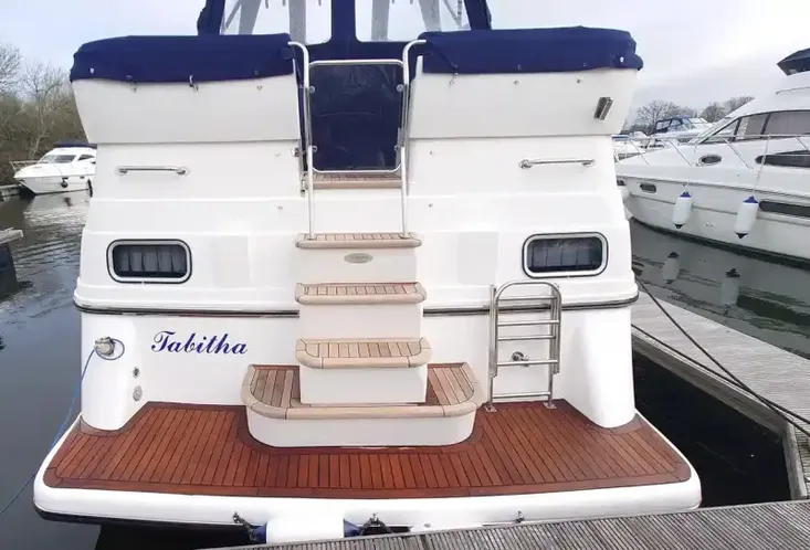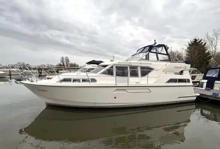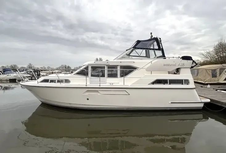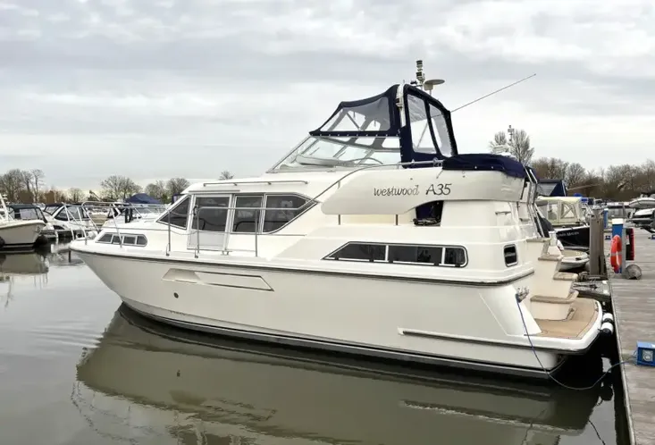 This beautifully presented Westwood A35 aft cabin cruiser is based on the Broom Ocean 34 mouldings with an extended full beam aft platform, which allowed for moulded steps to be incorporated rather than a vertical boarding ladder. The semi displacement hull shape offers relaxed low speed handling on rivers, with a sheltered coastal capability. Folding stainless steel radar arch and screens reduce the air draft for exploring the European inland waterways network, with spacious accommodation for four in two separate cabins. *PART EXCHANGE CONSIDERED*