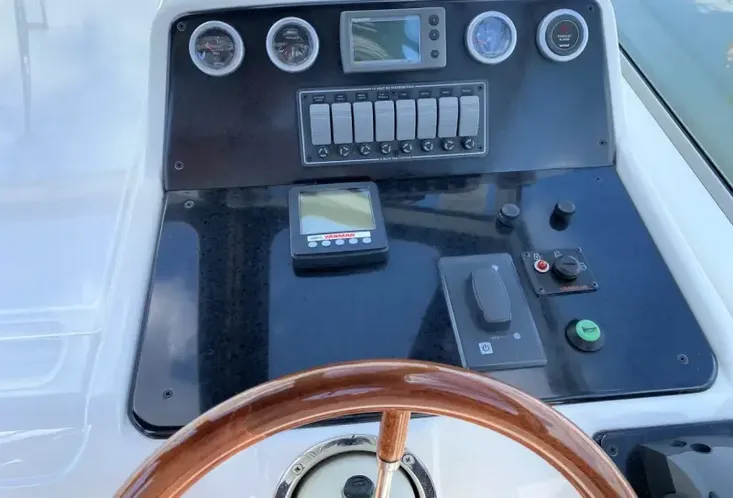 Back into the saloon and up the steps out on to the aft deck, the helm with engine controls and instrumentation is located on the starboard side and aft is seating for guests.