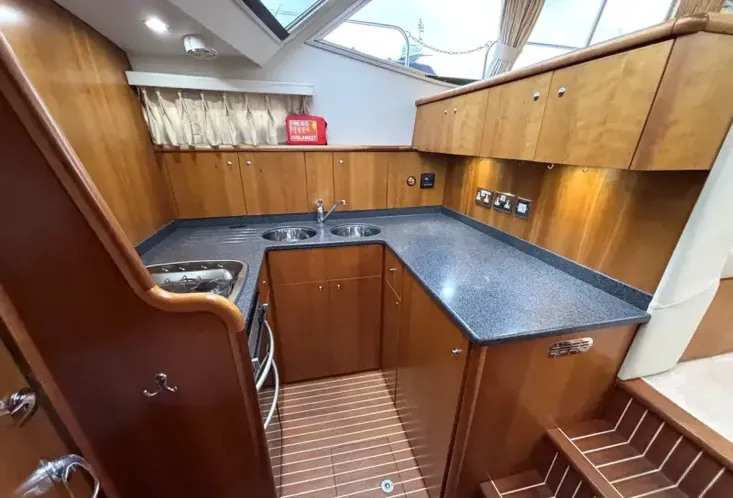 Opposite the heads is the U-shaped galley with good storage beneath work surfaces, fridge, twin stainless steel insert sinks, a 4 burner hob, a gas oven with a grill, holding tank gauge, plate storage & cutlery drawer.