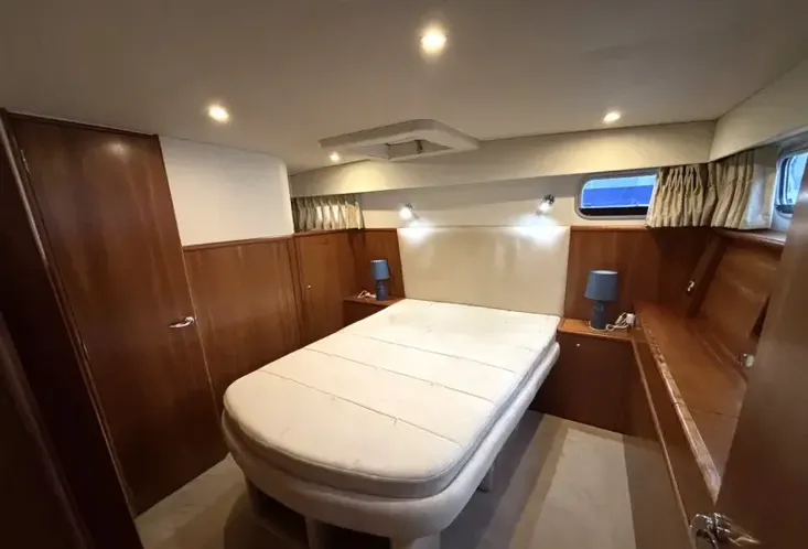 Moving aft on the port side two steps down is the aft cabin which has a large island double berth, twin bedside cupboards, a dressing table with storage and a mirror, upholstered headboard, escape hatch and reading lights.
