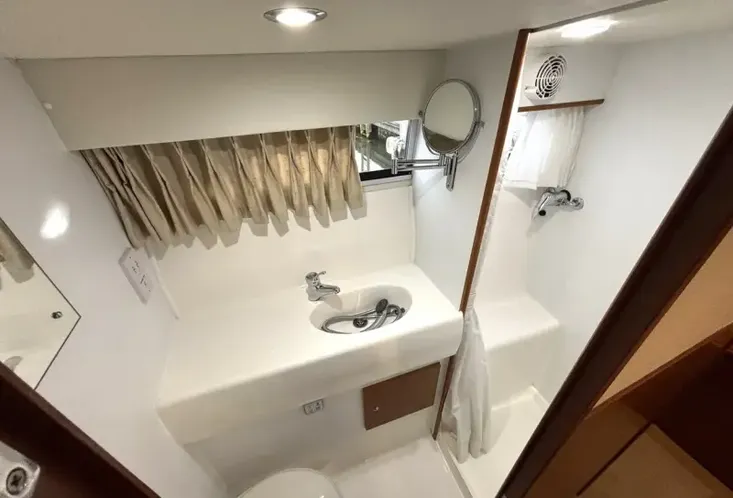 The ensuite heads on the starboard side with electric toilet to a holding tank, wash hand basin with mixer tap, a shaving point, mirror and a separate shower compartment.