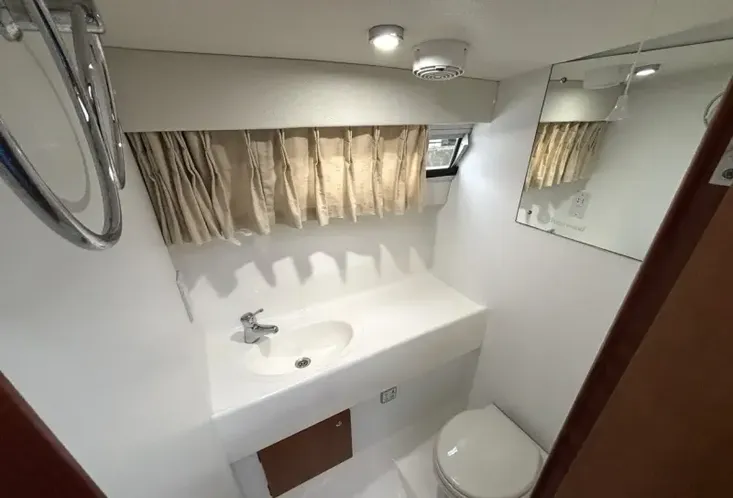 Moving aft, to port is the day heads with electric toilet to holding tank, wash hand basin with mixer tap, shaver point & mirror.