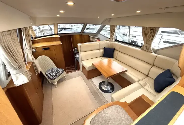 Moving aft up two steps into the saloon, to port side is a large cabinet with storage, side sliding door to access the side deck, a TV and a radio. Opposite is a large U-shaped sofa that seats four which convert to an occasional double berth.